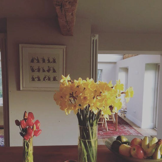 Winding down after a long day creating designs and posting orders. There's now beautiful evening sunshine streaming and cascading into our kitchen, as the days are getting longer!