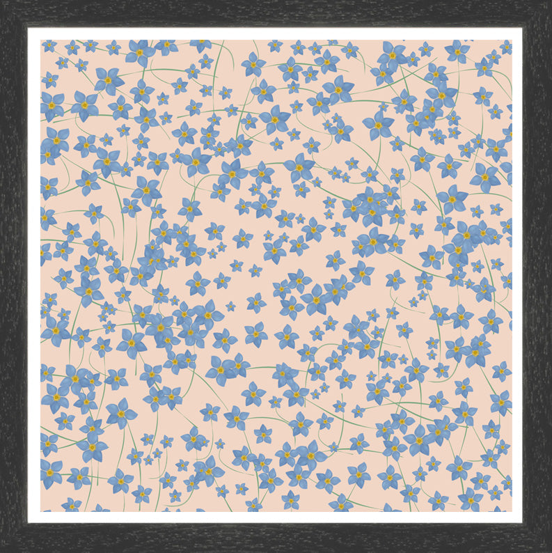 Fields of tiny forget-me-nots are everywhere and the butterflies are busy fluttering to every flower. All these forget-me-nots are hand drawn and combined together to make this timeless design. It's an image that looks great on any wall in the house and even more fabulous when paired up with the accompanying print from this series. This image has a soft pink background and a filled with a random pattern of little blue flowers . A simple and restful image to look at again and again.